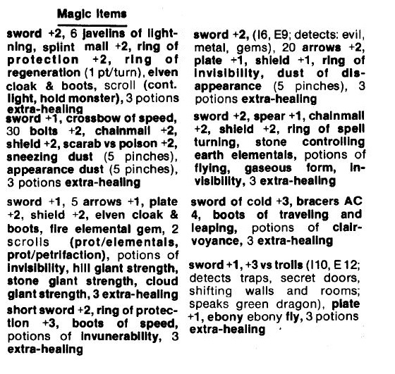 But on to the “Gygaxian no”. It forbids teleportation. Not all teleportation, but teleportation beyond a half mile. It does not forbid flight, or even spells like Dimension Door, which have a reach of much less than a half mile anyway. PCs have a lot of ways to fly, and to move across on the ground but faster or more easily. The pre-gen characters provided have two ways to fly (an ebony fly and a potion of flying) and two ways to move across the ground faster (boots of striding and springing and boots of speed). They also have access to a stone of controlling earth elementals, which can have all sorts of interesting effects on travel.